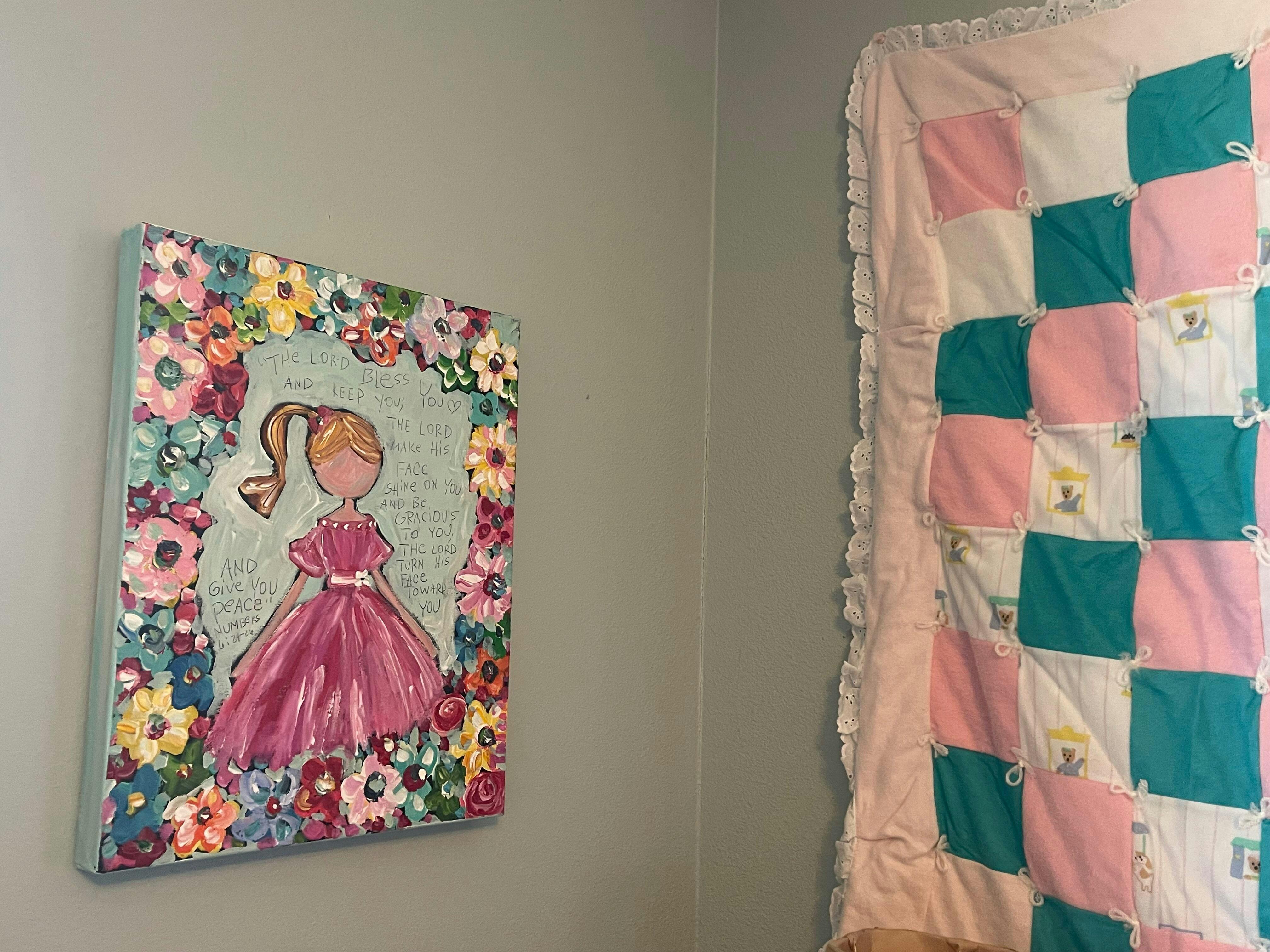 This painting caught my eye because I love pink, the flowers are so colorful, and it brings me joy! It is in our grandchildren room … we have two grandsons but hopefully there will be a girl someday! 😊