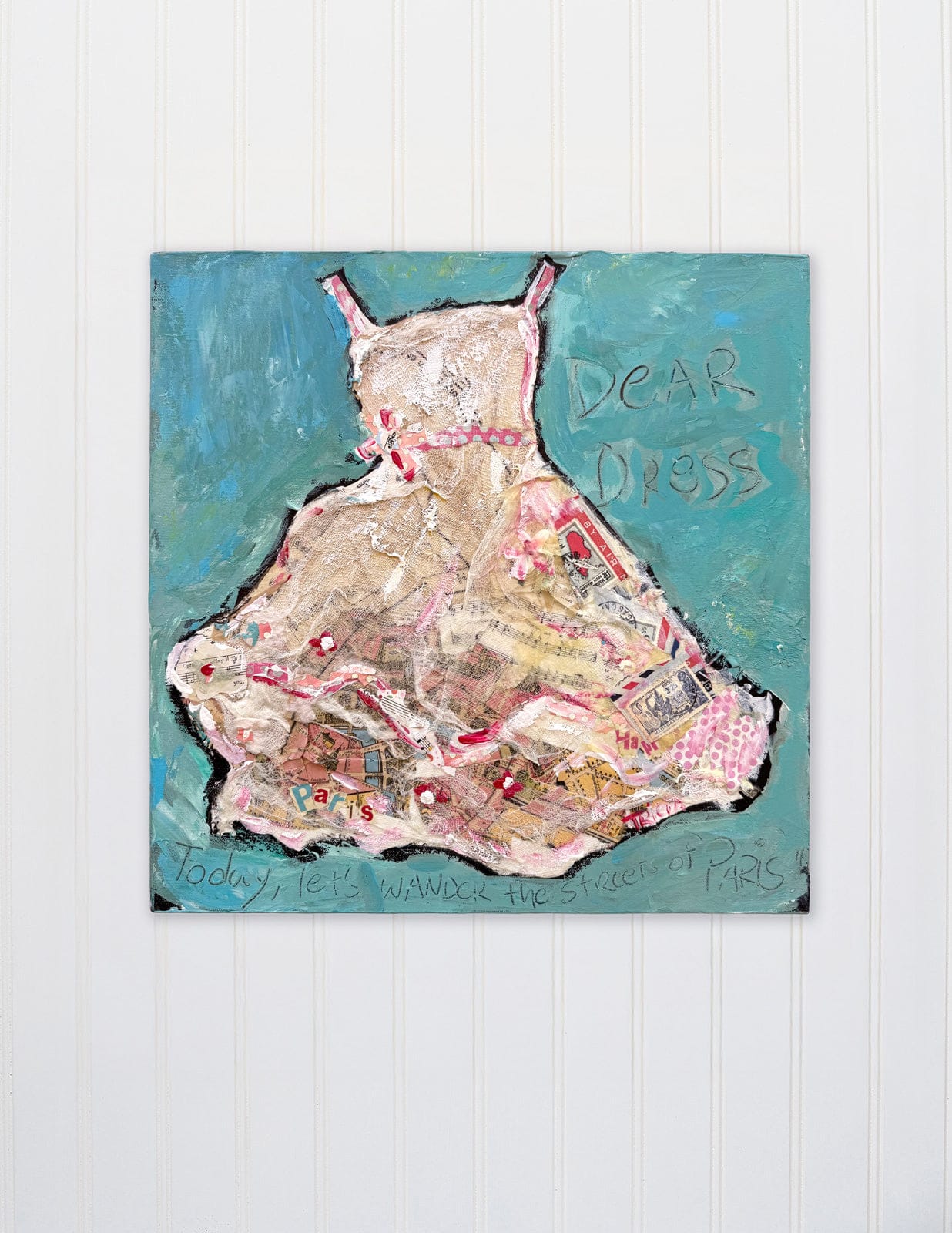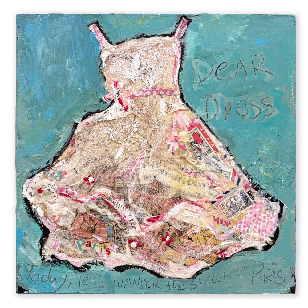 Mixed media (acrylic paint and paper) painting on gallery wrapped canvas.
